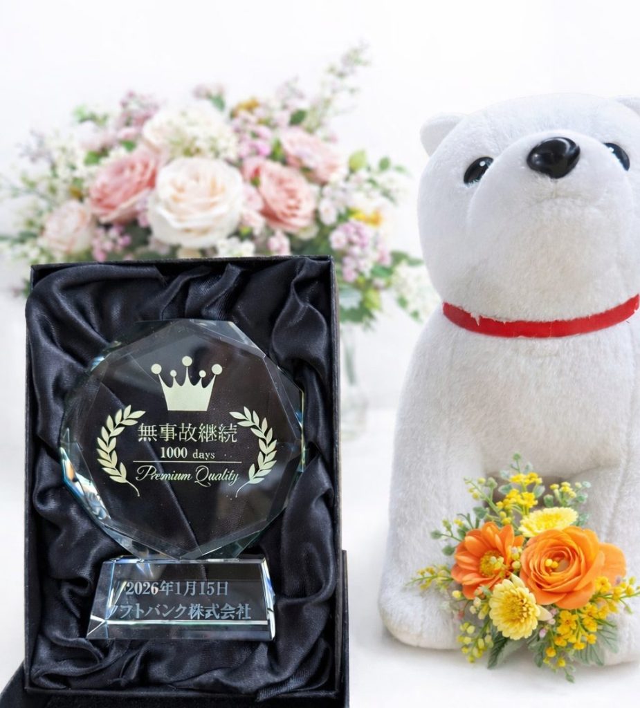 ソフトバンク株式会社様の中国エリアにて無事故継続1000日を達成し、一元請会社として表彰をいただきました。
